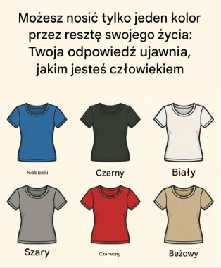 Obraz przedstawia sześć prostych opcji – niebieski, czarny, biały, szary, czerwony i beżowy – każda reprezentowana przez prostą koszulkę. Minimalistyczny design, żadnych rozpraszających elementów. Tylko kolor i wybór. I o to właśnie chodzi.