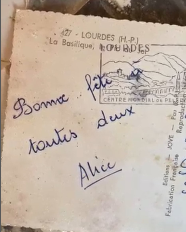 Ale Renaud, zawsze silny, zdołał wyważyć drzwi i posprzątać przestrzeń latarką. Za przepierzeniem ukryte były łóżko, szafa z męskimi ubraniami i zegar na ścianie – krótko mówiąc, mały pokój, który został zamknięty i zamurowany. Para była w szoku. Badając pokój w półmroku, Renaud kopnął walizkę. Była ewidentnie zrobiona z tektury, takiej, jaką mogli robić w latach 30. lub 40., i była ciężka. Renaud odwrócił ją. Rozniósł się nieprzyjemny smród. Walizka była pokryta pleśnią. Rozpadła się w pył razem z zawartością. Popękany portfel jednak przetrwał spustoszenie czasu: niewątpliwie należał do mężczyzny, właściciela tej walizki, z której praktycznie nic nie zostało. Mała kartka papieru wspominała o stacji kolejowej Auray, półtorej godziny od Cast. Ciekawość pary sięgnęła zenitu.Wśród skarbów w walizce znajduje się również zestaw pocztówek. I, o dziwo, jedna z nich jest podpisana przez Alicję.